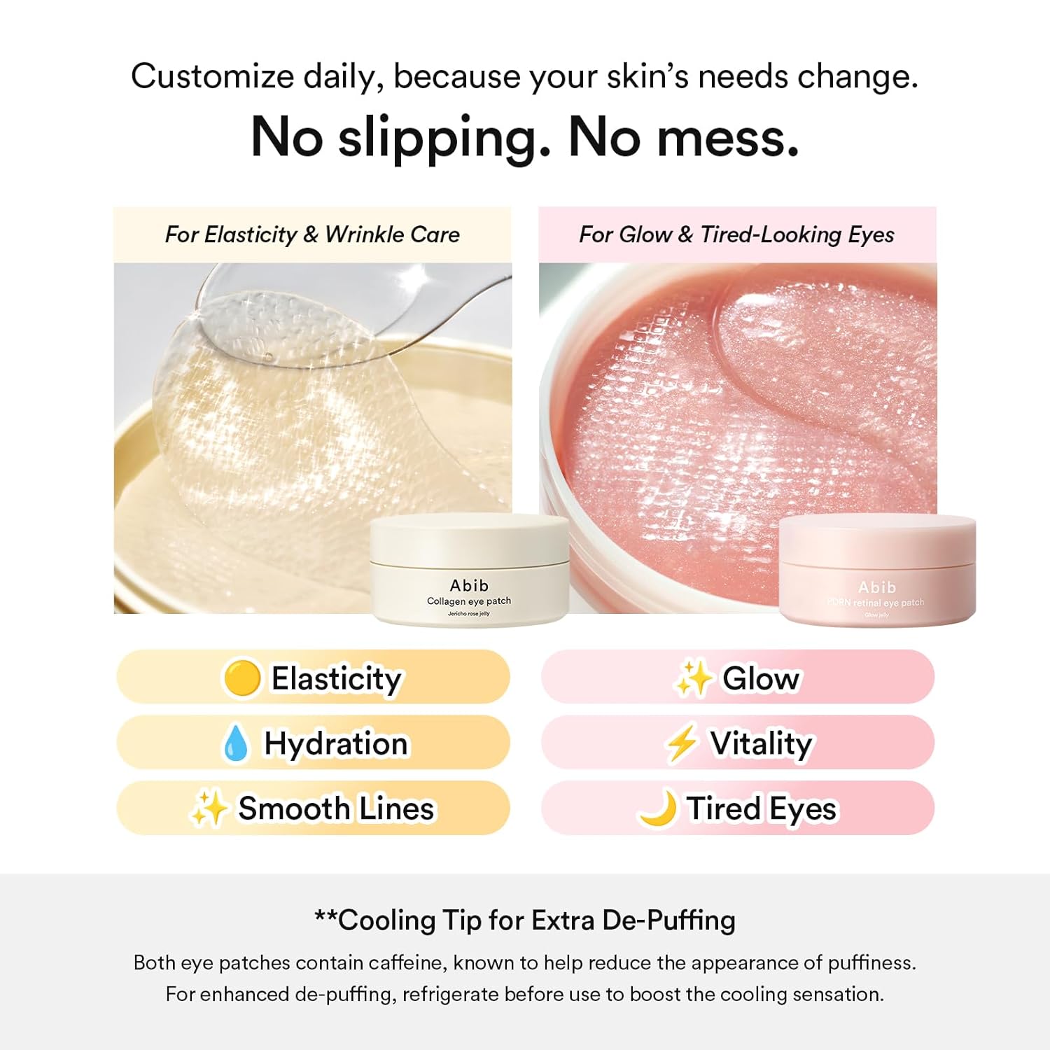 I’m so happy I found the Abib Collagen Peptide Eye Patches! I wear a pair every morning while getting ready and they work so well.First, they stay put. Once I apply them, they don’t slide around at all. I can go about my morning without constantly adjusting them. And they are easy to put on!Second, they feel so cooling and refreshing. My under eyes instantly feel and look more awake, bright and hydrated.After removing them, my under eye area looks smoother and less puffy. I have also noticed with consistent use, my morning bags look less full overall. These are definitely an add to cart essential for me!