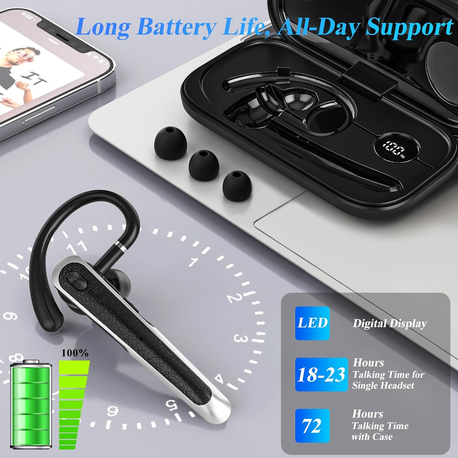 Bluetooth Headset, Wireless Bluetooth Earpiece with LED Display Charging Case, V5.3 Hands Free Noise Canceling Headphones with Dual-Mic for Computer/Laptop/Cell Phones/Home/Office/Trucker