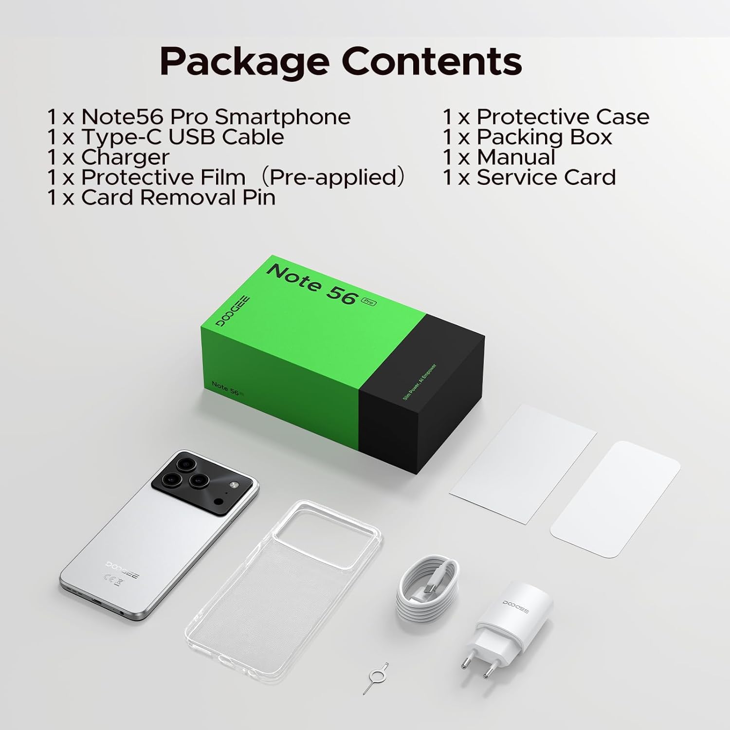 Charger x1/Type-C USB Cable x1, DOOGEE Note 56 Pro Cell Phone x1, Protective Case x1, SIM Card Pin x1/Packing Box x1/Warranty Card x1
