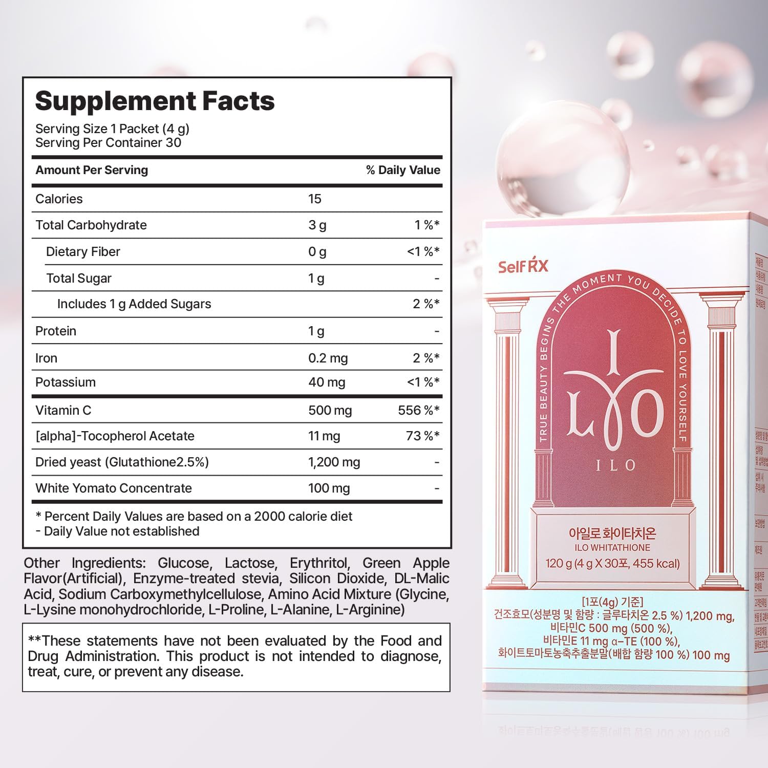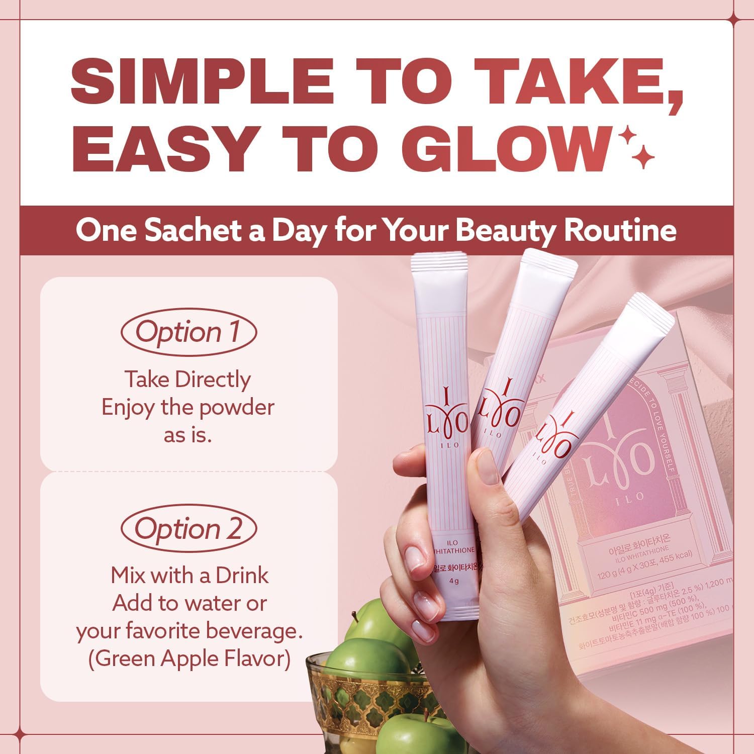 Let start of by saying that there’s nothing worse than good products getting bad reviews as a result of consumer blind buying and or their failure to thoroughly read the listed product description prior to order to educate themselves to determine if said product will suit their needs. This is a product of Dong-A Pharmaceutical; the Johnson & Johnson of South Korea which has 90-year history of leading pharmaceutical products which are widely popular throughout Asia and Europe.And with that said this ILO Whitathione dietary health supplement taste good and is easy to stomach as a powder but if you have a sensitive stomach I’d suggest adding it to a beverage. Coming from someone who’s not big on artificial flavors this Green Apple flavor is great. I find it to be much milder than a Jolly Rancher but it carries the same lingering after test which isn’t bad. I took this as a powder and easily washed away the after taste with a drink.Self care is the essential to true happiness and wellness; I find this supplement to be beneficial in both aspects. With it being packed with vitamin C almost immediately after consuming this I feel a boost of energy you may even experience a your temperature rise momentarily while becoming more alert. This is a great way to start your day your on the right foot but it’s also suitable for a mid afternoon boost!Overall I find this product to be of great quality and of excellent value in more ways than one and I would highly recommend for self care is everything! Stay positive! ✌🏽