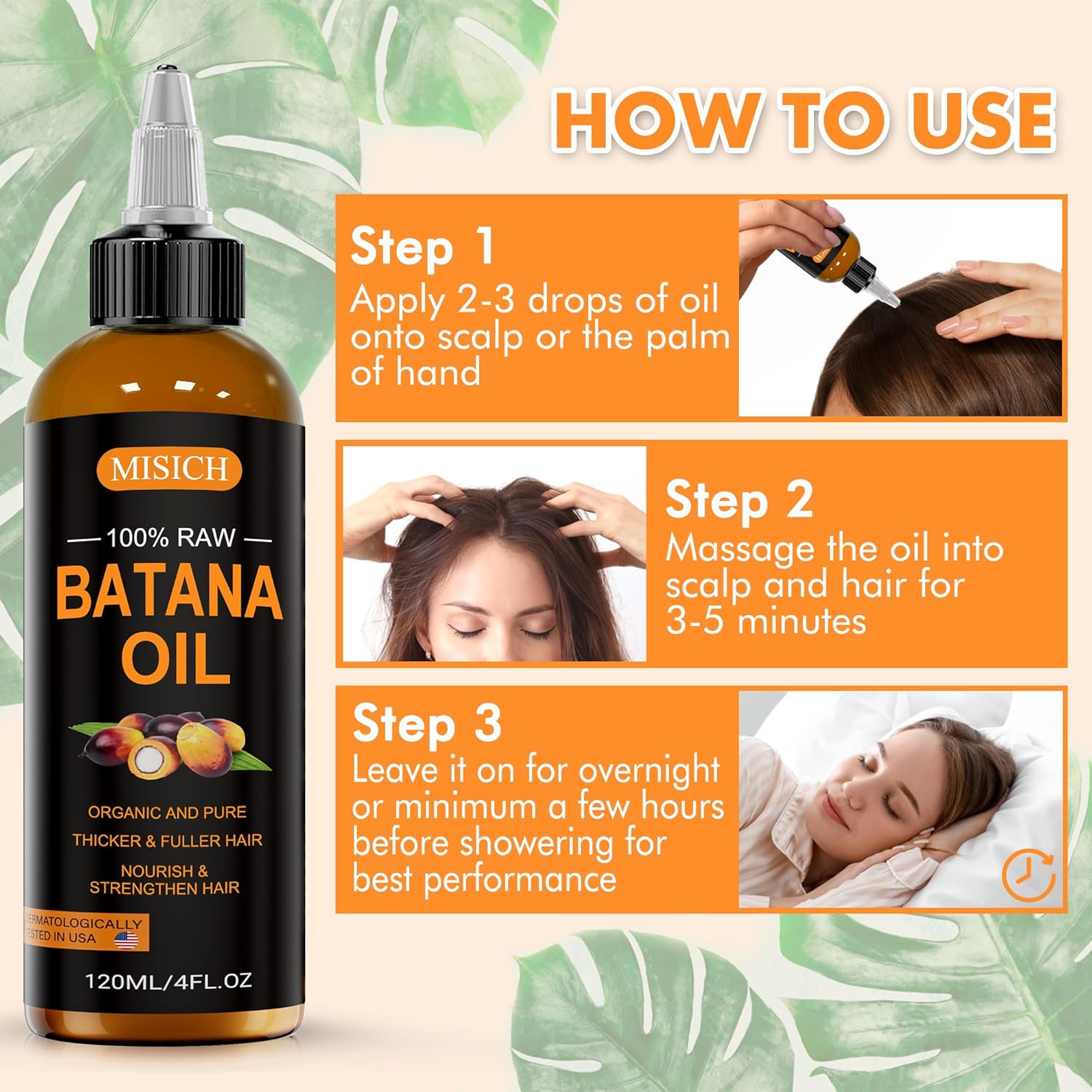 Easy to Apply: Massage 2-3 drops of bantan oil for 3-5 mintutes, and leave on overnight or at least a few hours to strength, nourish, and protect against hair damage