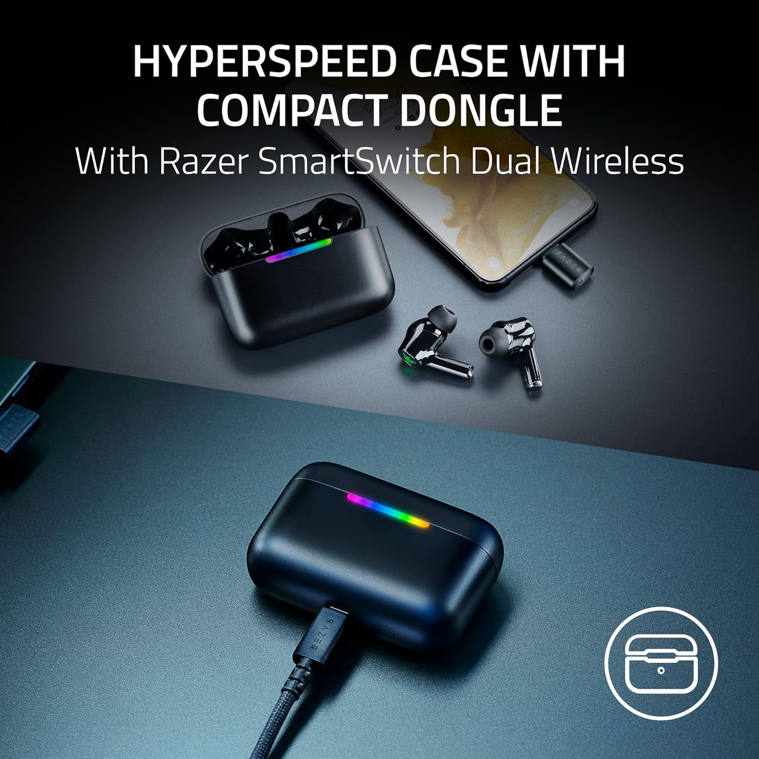 HYPERSPEED CASE WITH COMPACT DONGLE — Use the removable dongle on the go or plug in the case to play and charge at the same time, plus seamless switching between 2.4 GHz and Bluetooth