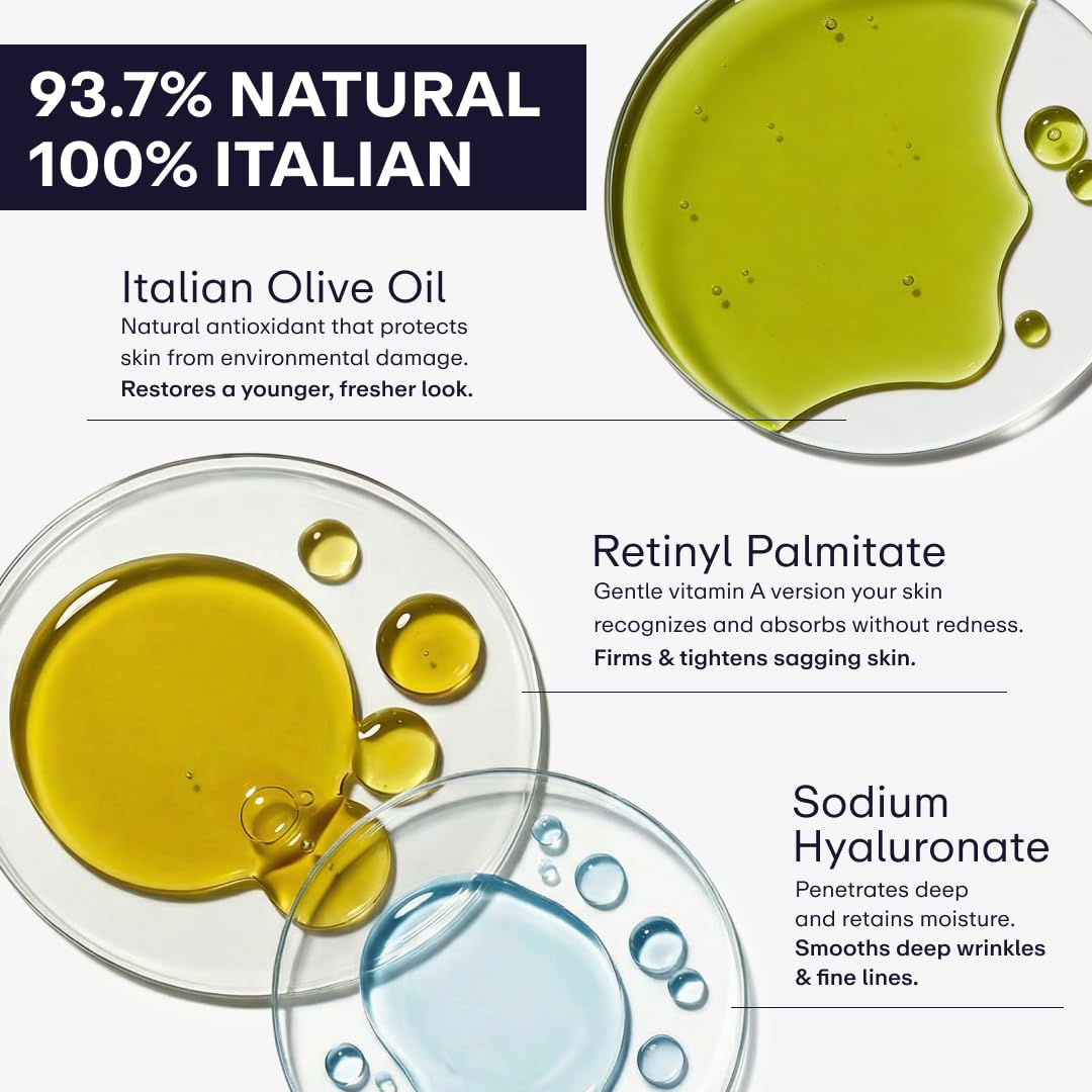 🌱 PREMIUM INGREDIENTS – Formulated with Retinol to reduce wrinkles, Hyaluronic Acid for long-lasting moisture, and Olive Oil to soften the skin, leaving it elastic and radiant.
