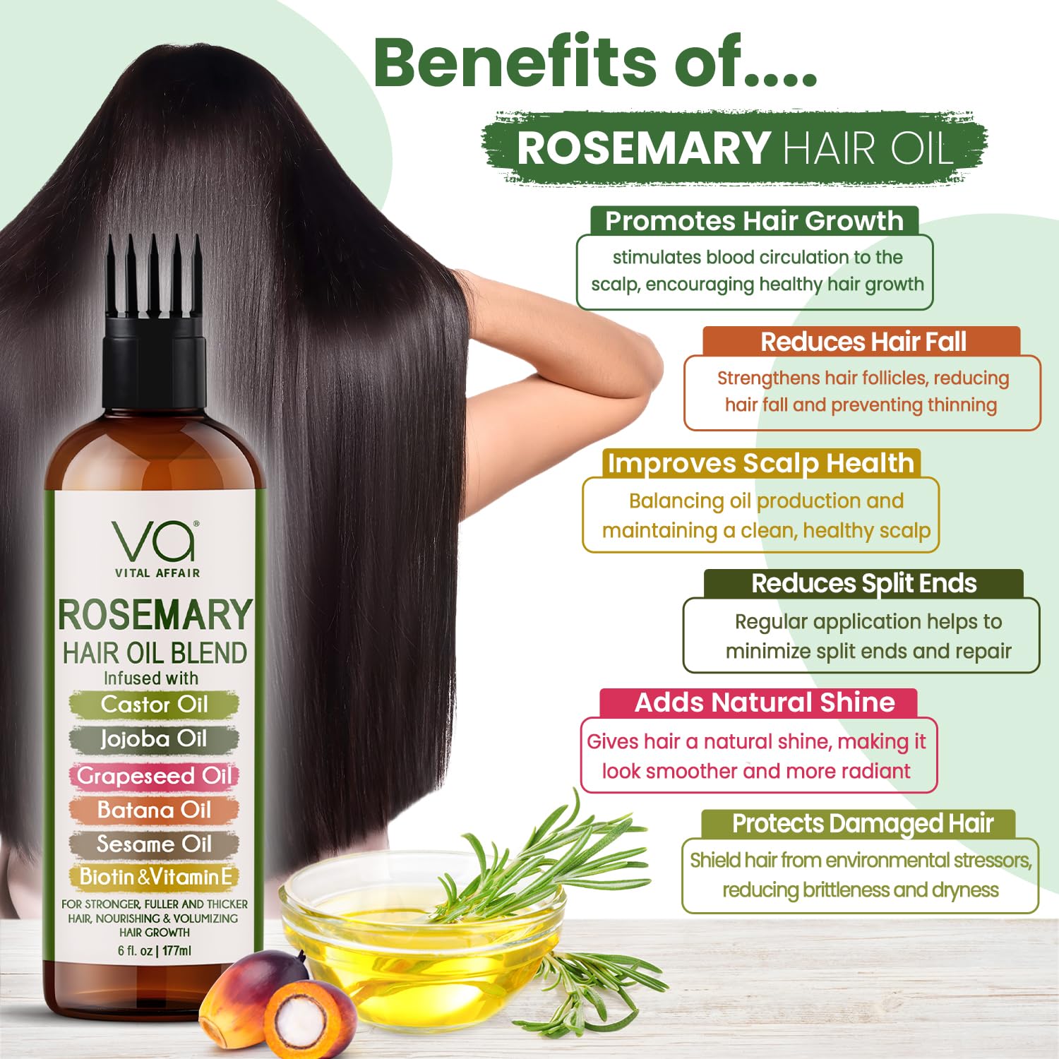 VITAL AFFAIR Blend Of Pure Rosemary Oil For Hair Growth With Castor, Batana, Jojoba Oil-Infused With Biotin & Vitamin E-Blend of Effective Hair Oils for Hair Growth-Strengthening Treatment 6 Fl Oz