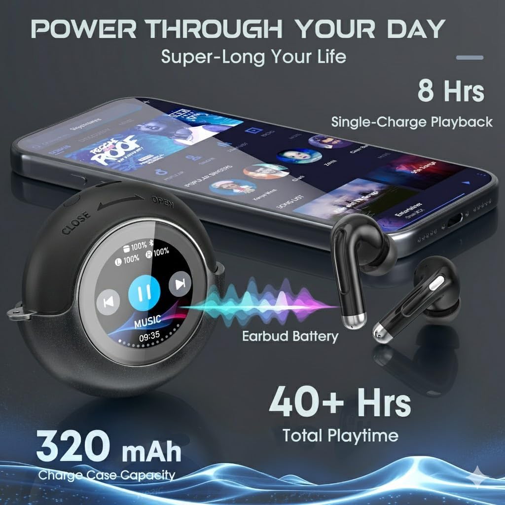【48-HOUR MARATHON POWER & TYPE-C CHARGING】 Designed for all-day use, the efficient T7 earbuds provide 4-5 hours of continuous music on a single charge. The 400mAh high-capacity rotating case creates a power reserve, extending total usage to over 48 hours. The smart screen displays real-time battery percentages for each earbud and the case independently, eliminating battery anxiety. Fully rechargeable via fast USB-C.